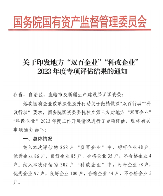 據(jù)了解,“科改企業(yè)”專(zhuān)項(xiàng)評(píng)估每年進(jìn)行一次,旨在落實(shí)國(guó)有企業(yè)改革深化提升行動(dòng)關(guān)于做精做深“科改行動(dòng)”要求。本次國(guó)務(wù)院國(guó)資委委托獨(dú)立第三方對(duì)地方“科改企業(yè)”2023年度工作開(kāi)展情況進(jìn)行了專(zhuān)項(xiàng)評(píng)估,考核結(jié)果按照得分高低分為標(biāo)桿、優(yōu)秀、良好、合格、不合格五個(gè)等級(jí),考核內(nèi)容涉及企業(yè)科技創(chuàng)新、體制機(jī)制、綜合成效等方面共計(jì)47項(xiàng)指標(biāo),全面權(quán)威地反應(yīng)了企業(yè)在加快科技新成果轉(zhuǎn)化、提升自主創(chuàng)新能力等方面的舉措和成果。