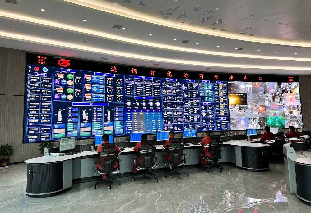 在漣鋼智能協(xié)同管控中心,LED屏幕上躍動著煉鋼環(huán)節(jié)的各項數(shù)據(jù)參數(shù)和生產(chǎn)一線的實時畫面,技術工人正在監(jiān)測分析生產(chǎn)動態(tài)信息。